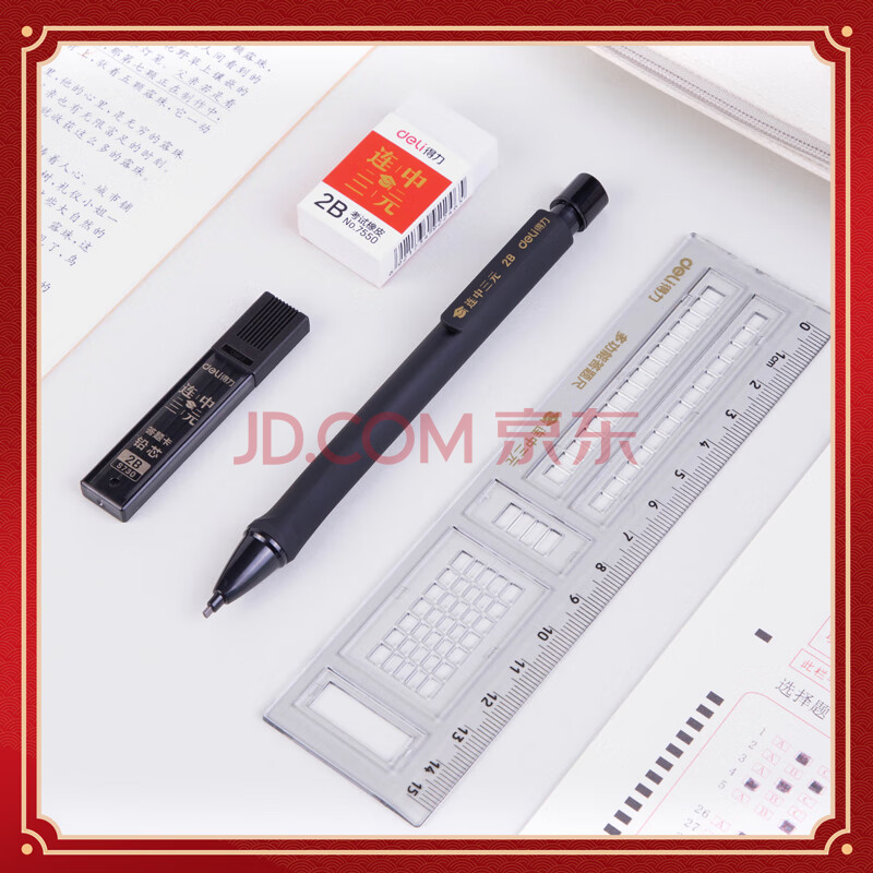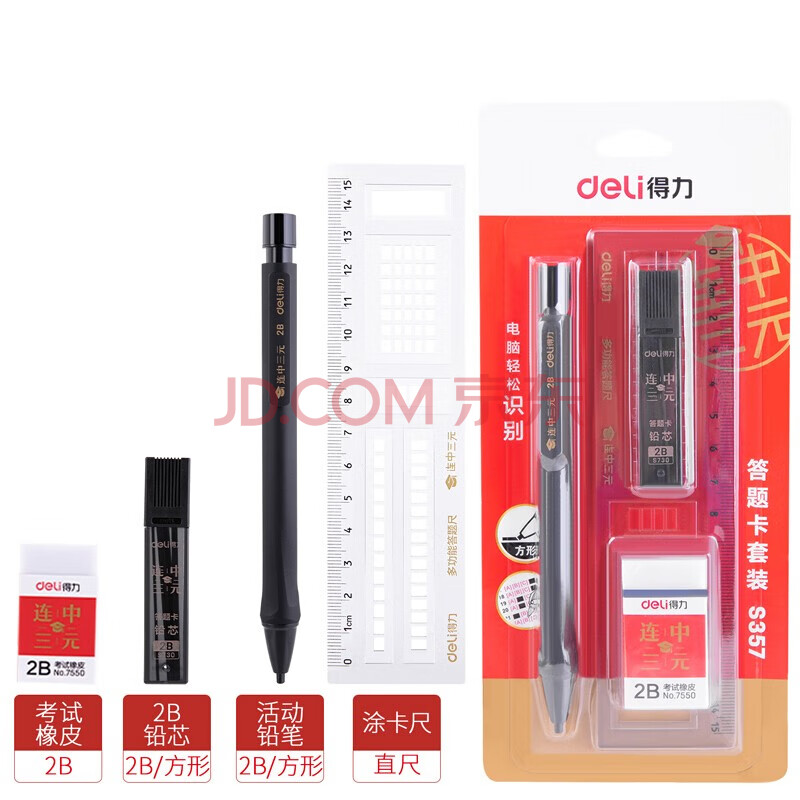 商品相册:得力连中三元考试涂卡铅笔套装4件套 2B铅笔/铅芯/橡皮/涂卡尺 考试可用中高考专用S357第