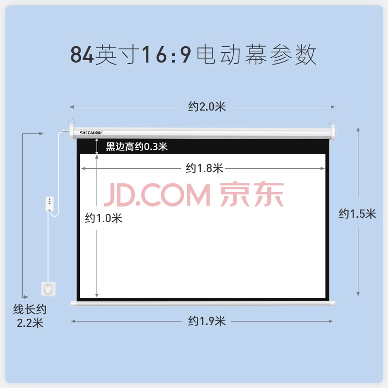 商品相册:设彩 SHECAI 84英寸电动投影幕布16:9投影布家用遥控自动升降壁挂幕室内家庭影院投影仪幕布70101白玻纤第