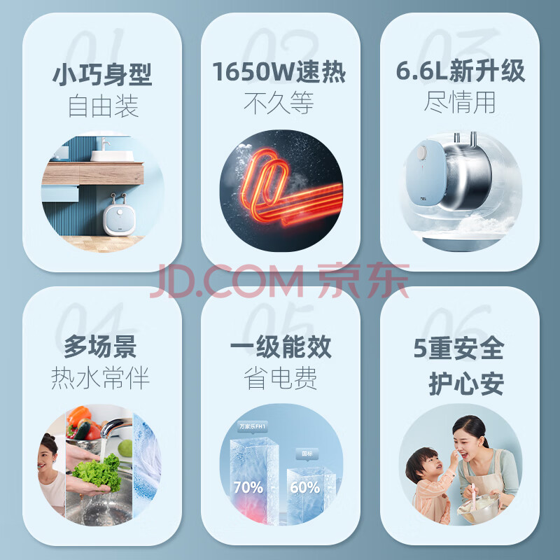 商品相册:万家乐【安全耐用FH1(S)】 6.6升安全防漏电小尺寸上出水一级能效1650W速热 厨房小厨宝电热水器第