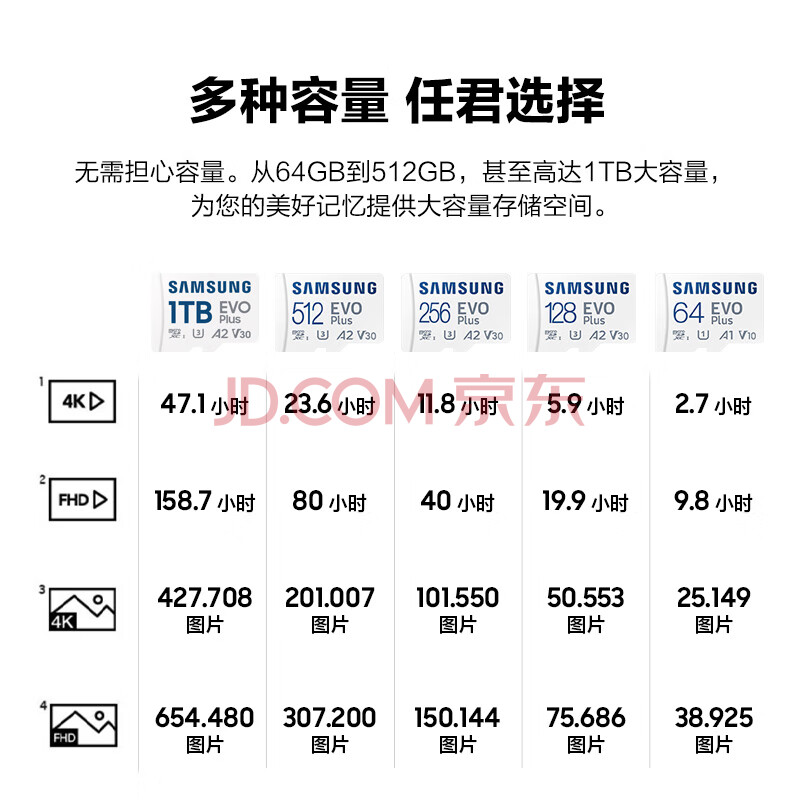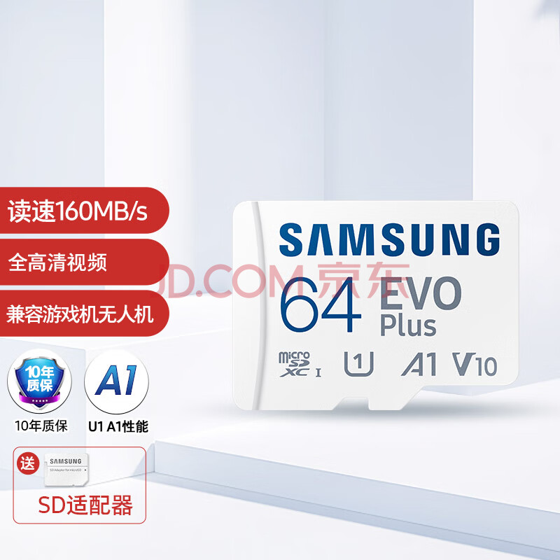 商品相册:三星(SAMSUNG)64GB TF(MicroSD)存储卡 EVO白卡 U1 A1 V10 手机平板行车记录仪游戏机switch内存卡 读速160MB/s第