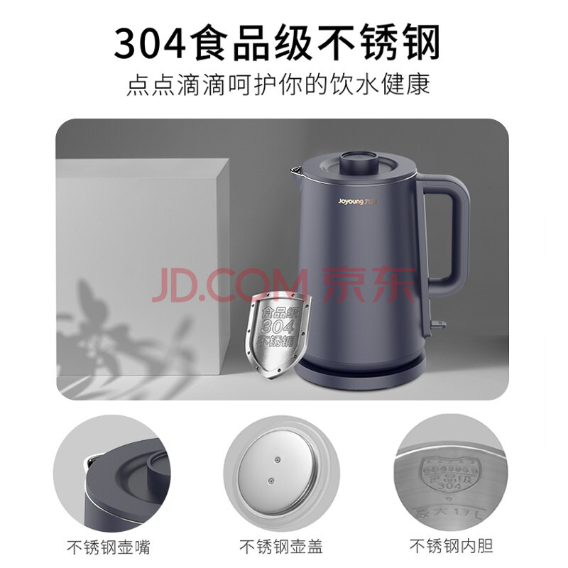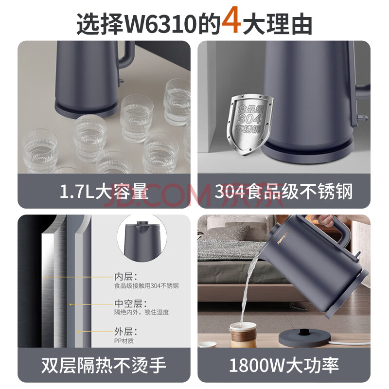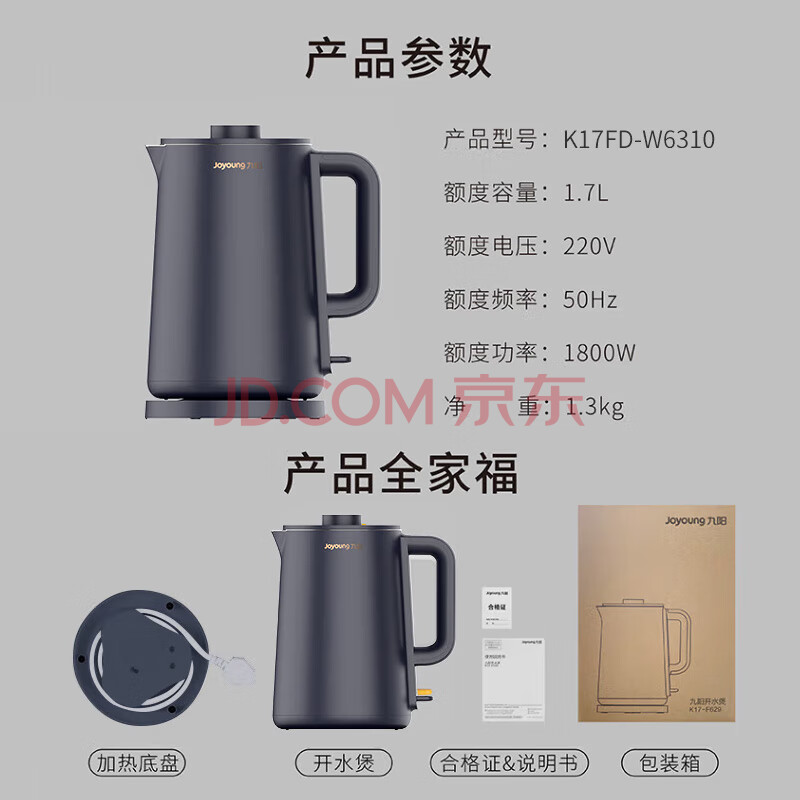 商品相册:九阳(Joyoung)热水壶烧水壶1.7L无缝内胆双层锁温防烫家用电热水壶K17FD-W6310第