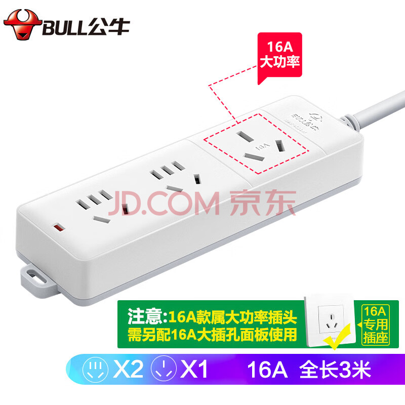 商品相册:公牛(BULL)大功率16A插座16a排插/插排/插线板接线板 适用空调热水器电暖气 3位无开关全长3米送10A头 405D 第