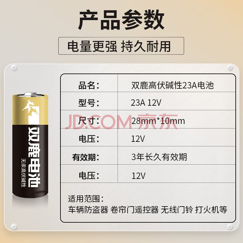 商品相册:双鹿 23A 12V高伏碱性电池 适用车门遥控器/车辆防盗器/电子词典/手表/血糖仪/遥控器等第