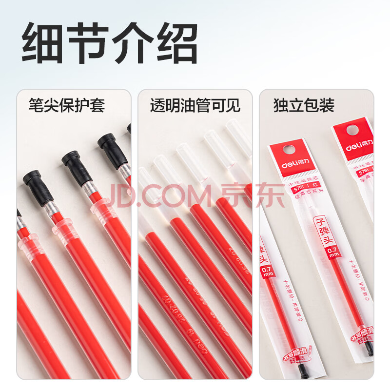 商品相册:得力(deli)0.7mm拔帽中性笔芯子弹头替芯 办公用品 红色20支/盒S761第
