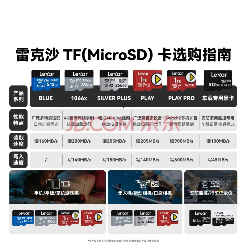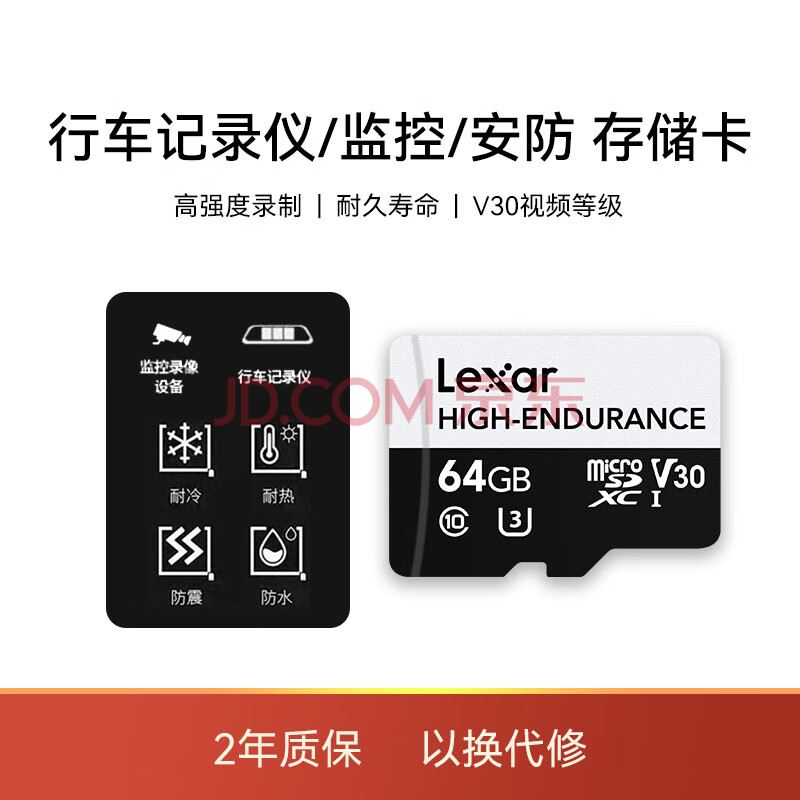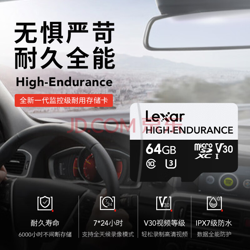 商品相册:雷克沙(Lexar)64GB TF(MicroSD)存储卡 C10 U3 V30 读速100MB/s 行车记录仪内存卡 安防监控专用高度耐用第