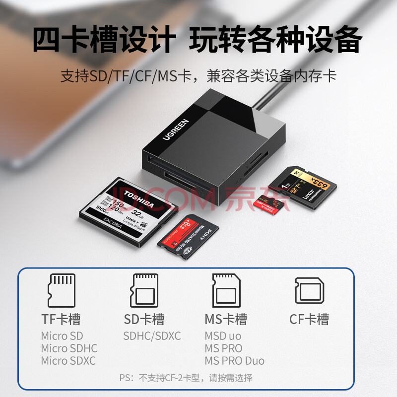 商品相册:绿联USB3.0高速CF读卡器 多功能四合一读卡器 支持CF/MS/SD/TF型相机记录仪监控手机平板储存卡 线长1m第