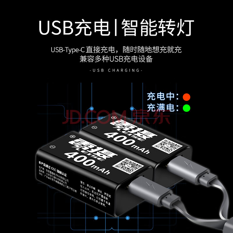 商品相册:雷摄(LEISE)充电电池 九伏/Type-C锂电池400mAh (2节装) 大容量 适用:万用表/玩具遥控器/烟感探测器 USB-9V 第