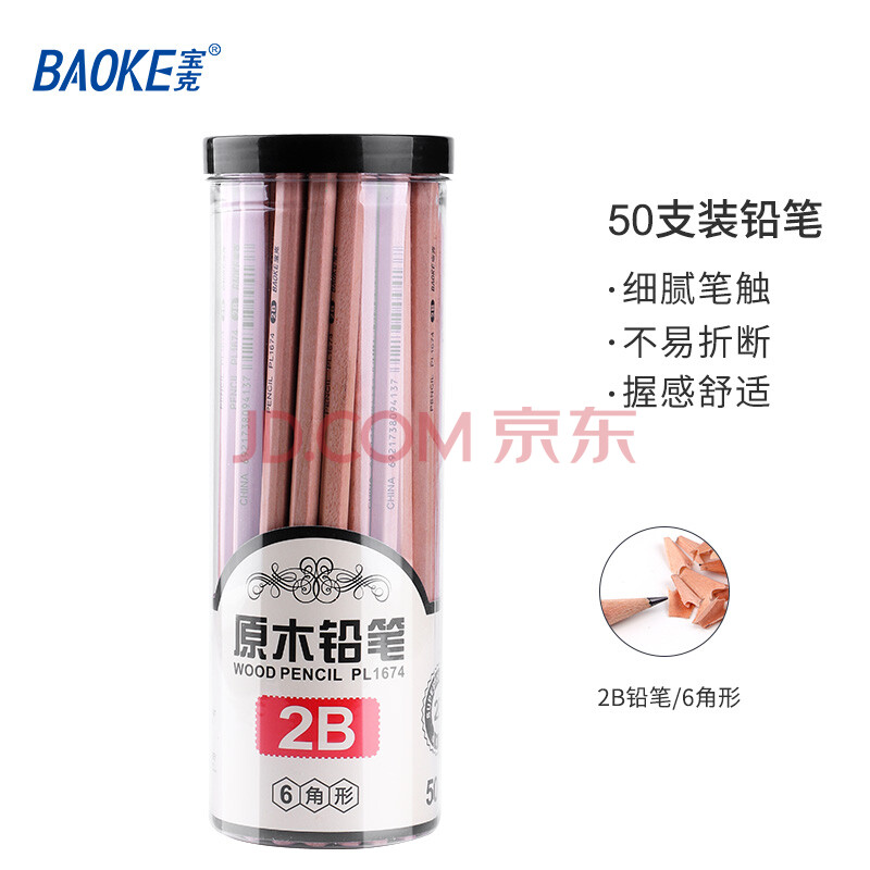 商品相册:宝克(BAOKE)PL1674 原木六角笔杆2B铅笔绘图铅笔考试铅笔 50支/桶第