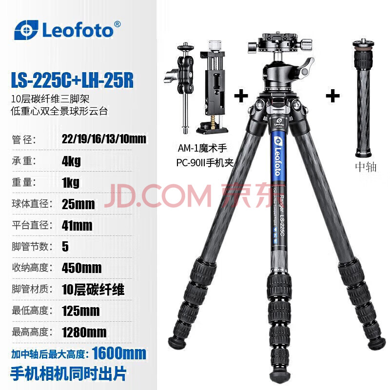 商品相册:徕图(Leofoto) 三脚架 碳纤维手机支架佳能尼康相机镜头摄影三脚架云台套装 LS-225C套装+AM-1+PC-90II+DC-222C第