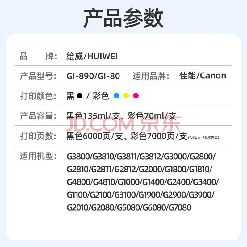 商品相册:绘威GI-890/80墨水 适用佳能G3800 G2810 G1810 G3810 G2800 G3000 G3812 4810 2010 canon打印机墨水2黑3彩第