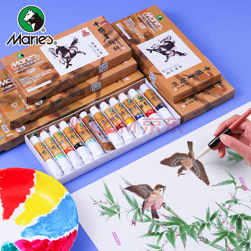 商品相册:马利(Marie's)国画颜料盒装12色12ml水墨画山水画学生初学者套装毛笔墨汁调色盘毛毡宣纸专业国画颜料套装第