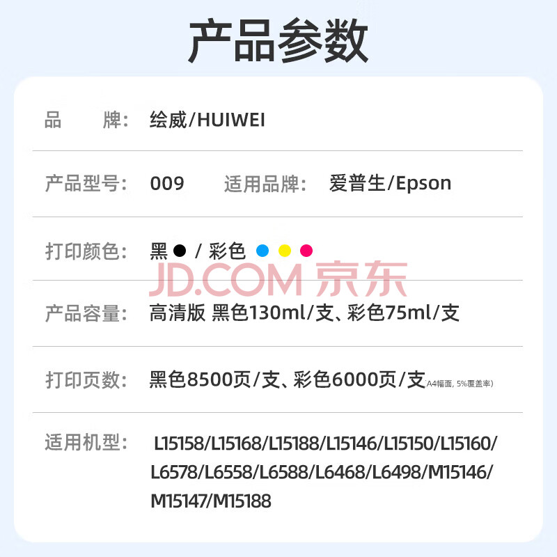 商品相册:绘威适用爱普生009墨水L6468 L15158 L15168 L6498 L6558 L6578 L6588 L15188 epson墨仓式打印机墨水 蓝色墨水第