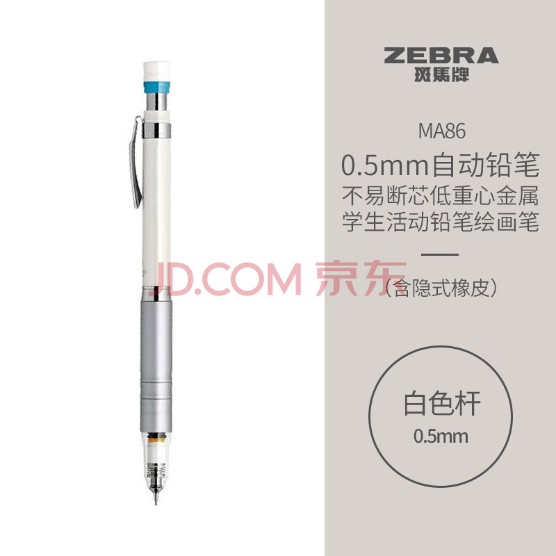 商品相册:斑马牌 (ZEBRA)0.5mm自动铅笔 不易断芯低重心金属学生活动铅笔绘画笔(含隐式橡皮)MA86 白色杆第