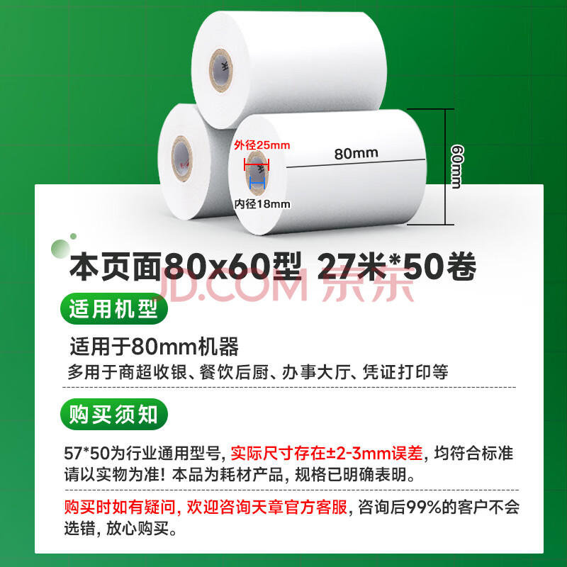 商品相册:天章 (TANGO)80*60mm27米*50卷 新绿天章热敏收银纸 京东外卖餐饮后厨小票纸 商超收银凭证打印纸 适配80mm机器第