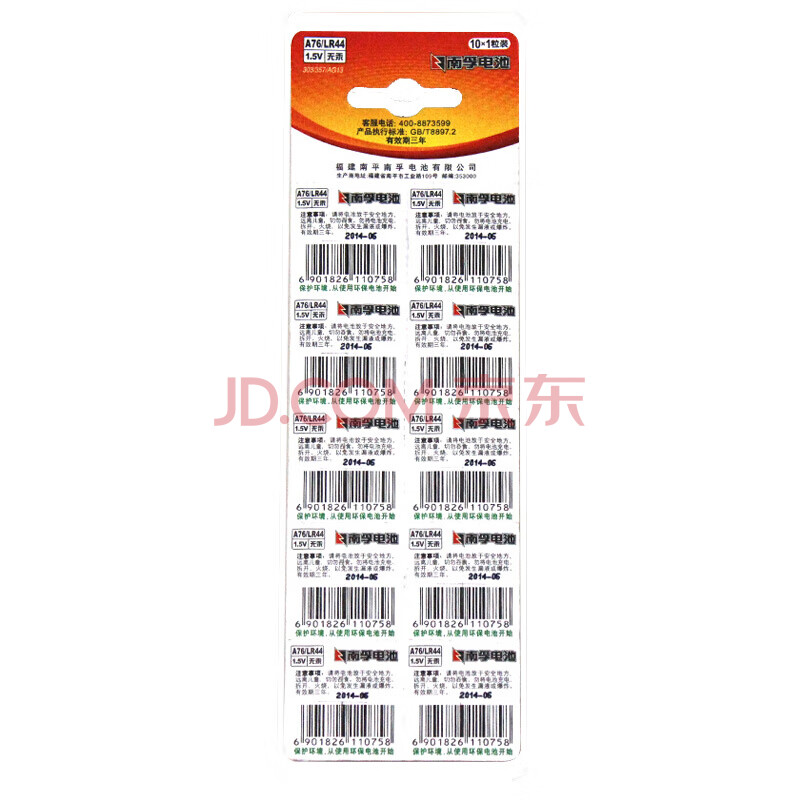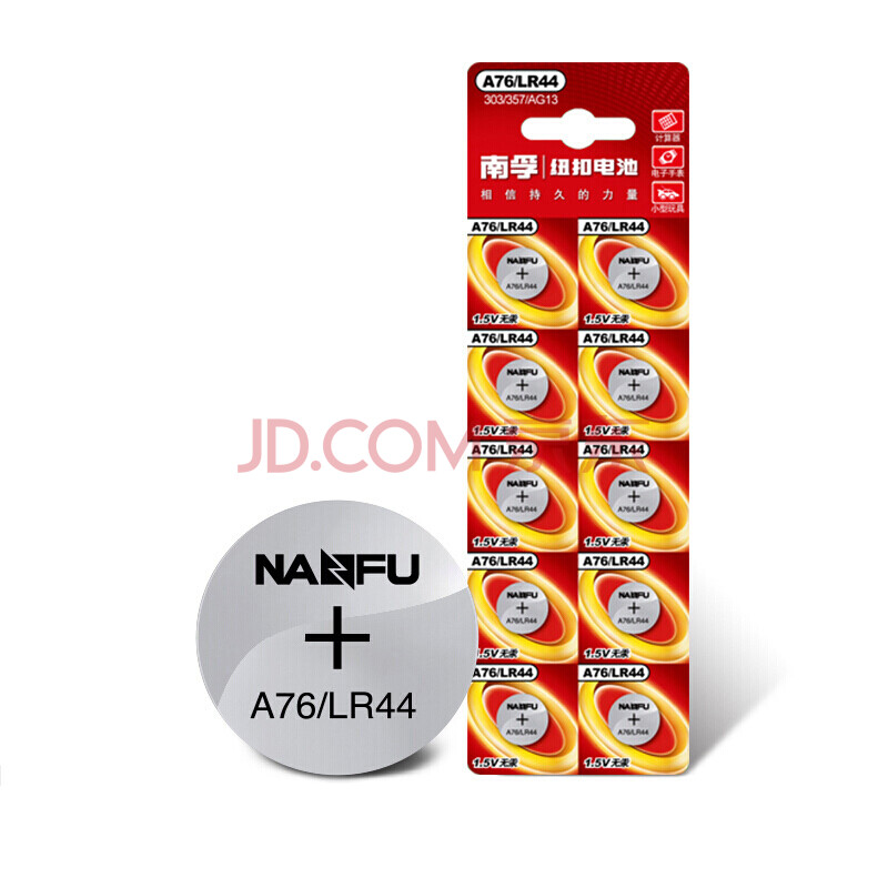 商品相册:南孚 A76/LR44 纽扣电池 1.5V 10粒/卡 2卡装(共20粒)适用于手表 计算器 游标卡尺 体重秤第