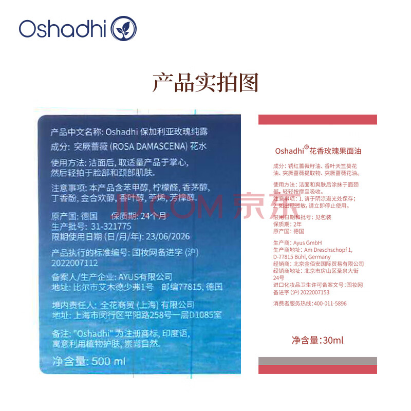 商品相册:Oshadhi补水保湿油敷礼盒玫瑰纯露500ml+玫瑰果油30ml 生日礼物效期27.7第