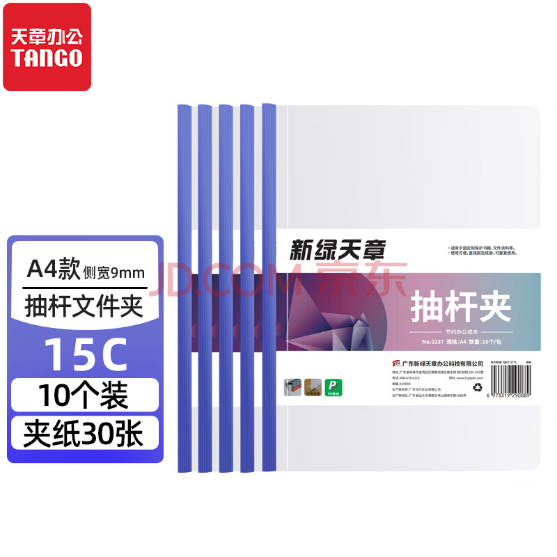 商品相册:天章 (TANGO) 新绿天章 抽拉杆文件夹透明抽杆夹A4蓝色9mm10个装报告资料简历试卷书本纸夹子办公用品 0237第