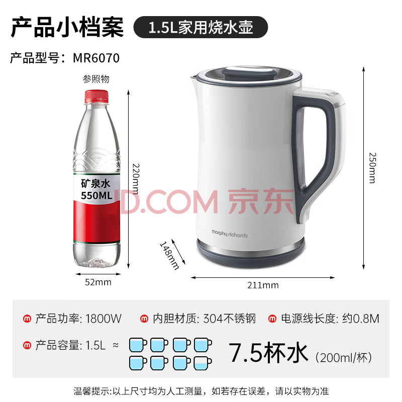 商品相册:摩飞电器(Morphyrichards)电热水壶烧水壶热水壶 家用恒温水壶1.5L不锈钢304双层防烫实时显温开水壶MR6070白第