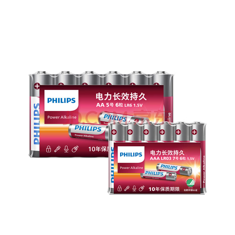 商品相册:飞利浦(PHILIPS)碱性5号电池7号电池各6粒/12粒 十年聚能锁电适用玩具鼠标智能门锁/指纹锁剃须刀血压计电池5号第