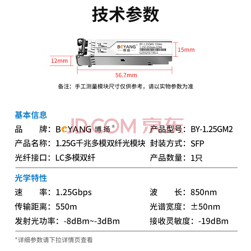 商品相册:博扬 BY-1.25GM2 SFP光模块千兆1.25G多模双纤光纤模块(850nm,550m,LC)适配交换机SFP-GE-SX-MM850-A第