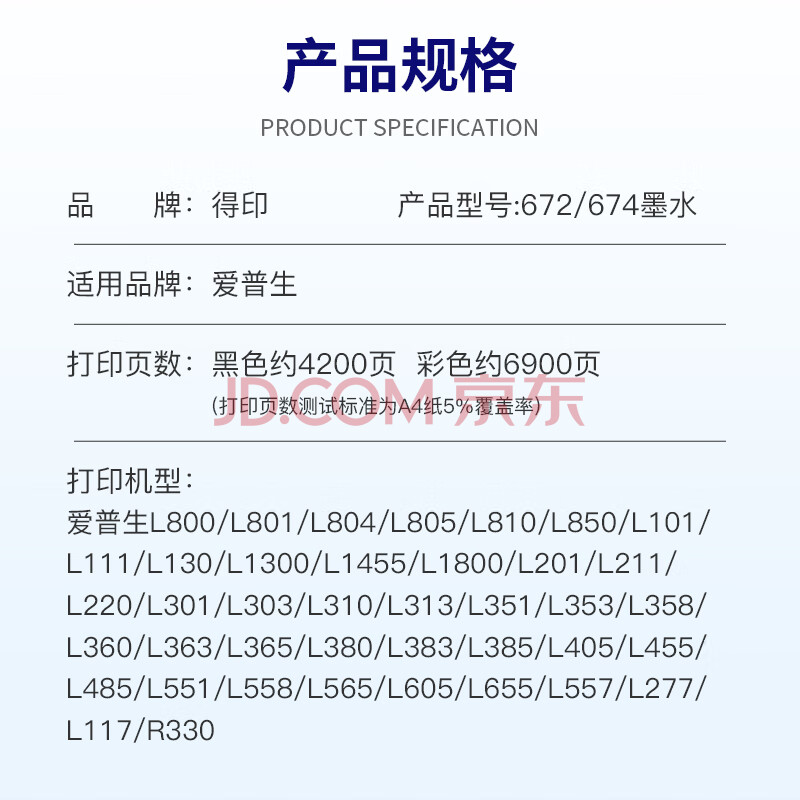 商品相册:得印 T6721 T6741墨水 适用爱普生L101 L130 L220 L310 L551 L565 L805 L1300 L1800打印机672 674黑色墨水第