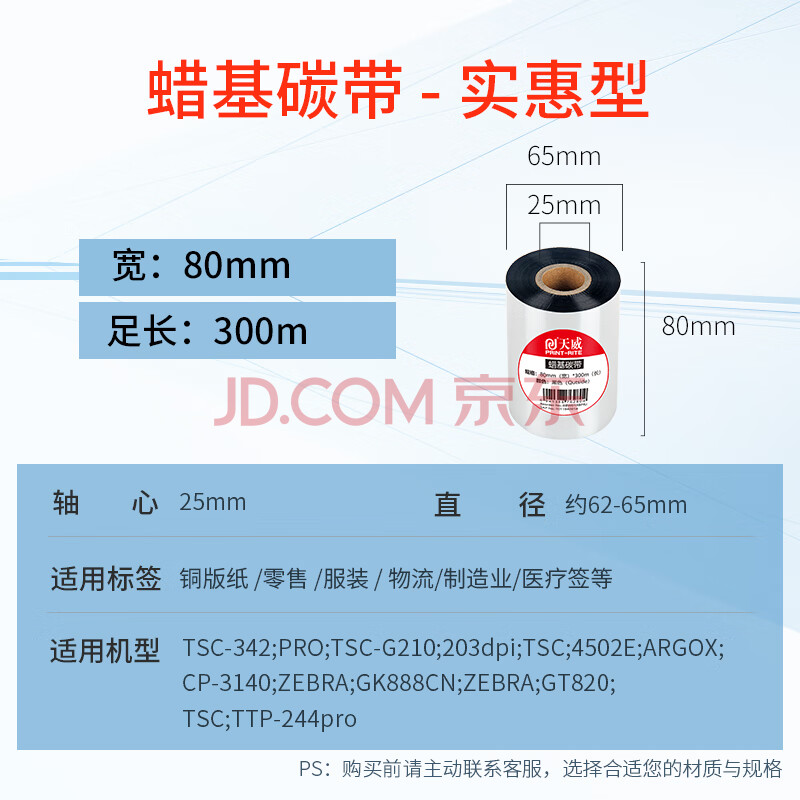 商品相册:天威 蜡基碳带卷80mm*300m 条码机标签机热转印打印机色带第