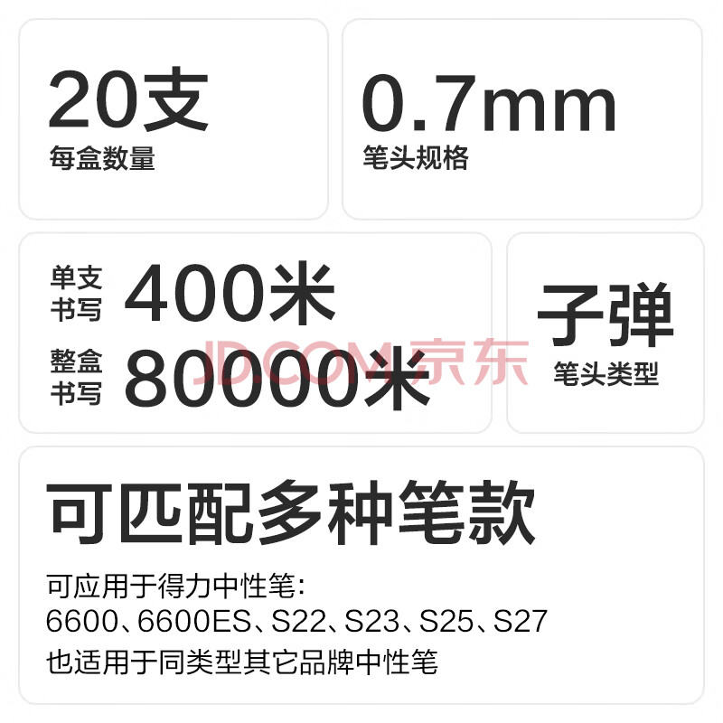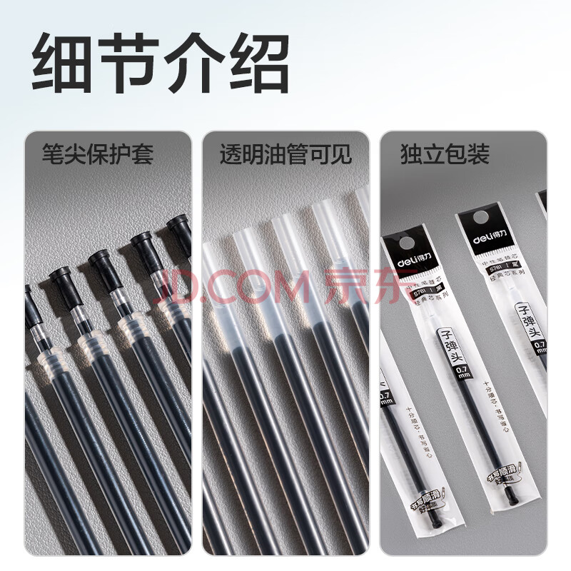 商品相册:得力(deli)0.7mm拔帽中性笔笔芯子弹头替芯 办公用品 黑色20支/盒S761 开学文具第