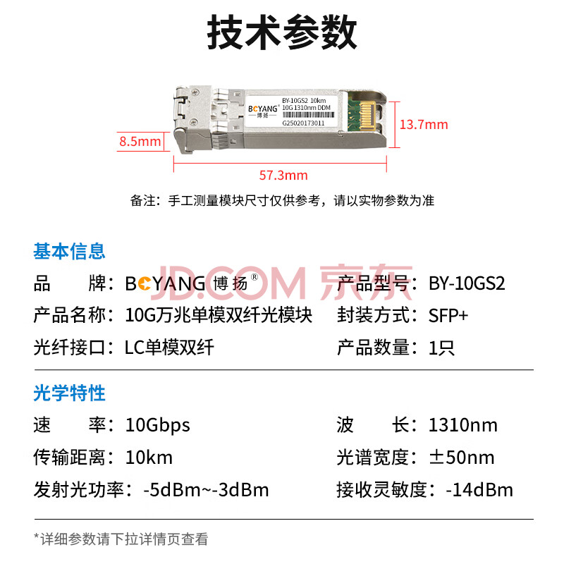 商品相册:博扬(BOYANG) BY-10GS2 SFP+光模块万兆10G单模双纤光纤模块(1310nm,10km,LC)适配国产交换机SFP-XG-LX-SM1310第