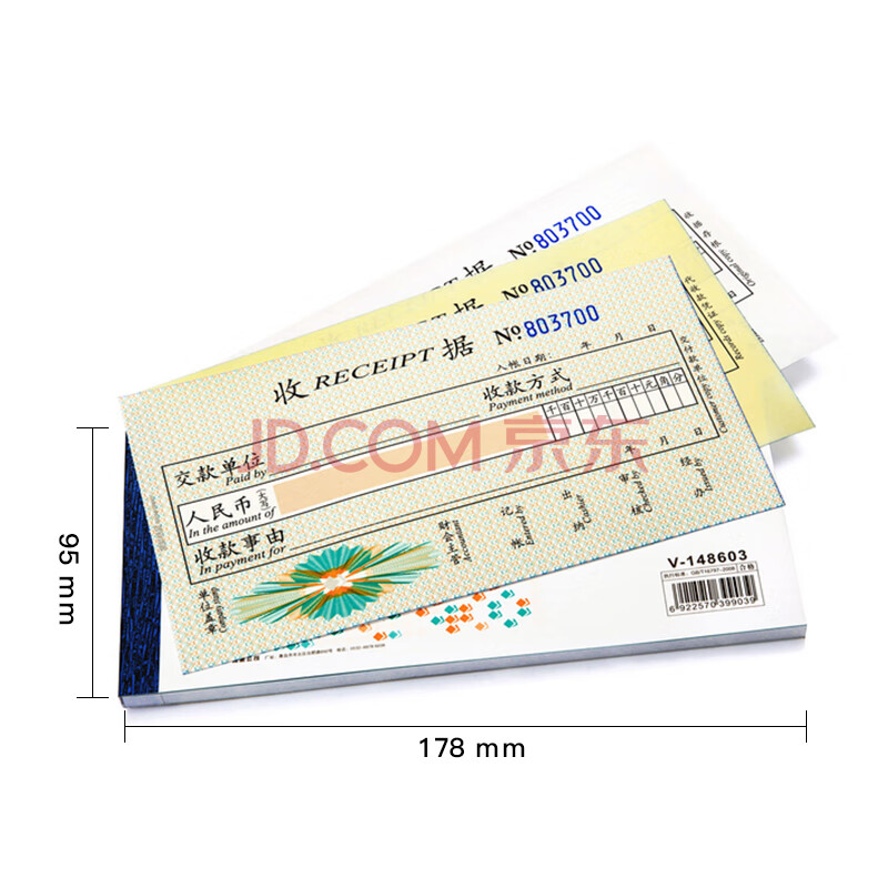 商品相册:凯萨(KAISA)48K/三联防伪科目收据VERITAS系列商务无碳复写单栏票据 中英文单据 20组/本 V148603第