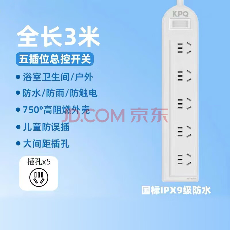 商品相册:KPQ零触KPQ不触电插座IPX9级防水过载短路保护插排户外防雨排插厨房浴室防潮儿童防触电DF05全长3米第