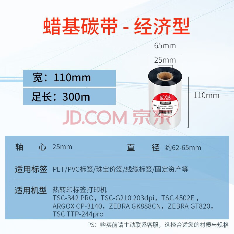 商品相册:天威 蜡基碳带卷110mm*300m 双支装 条码机标签机热转印打印机色带第