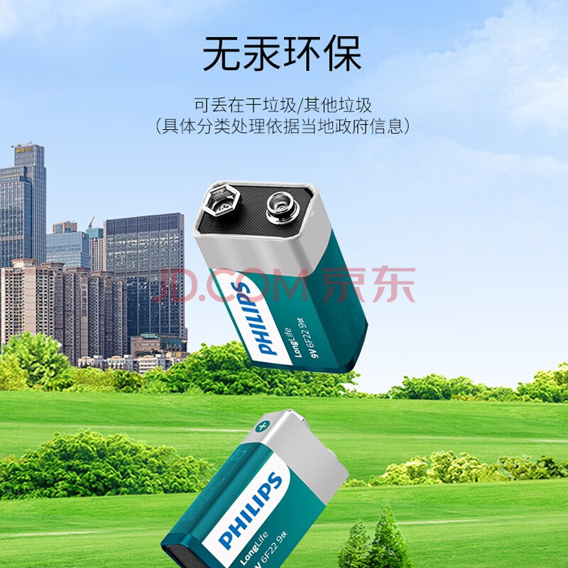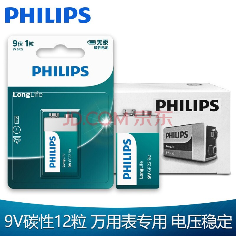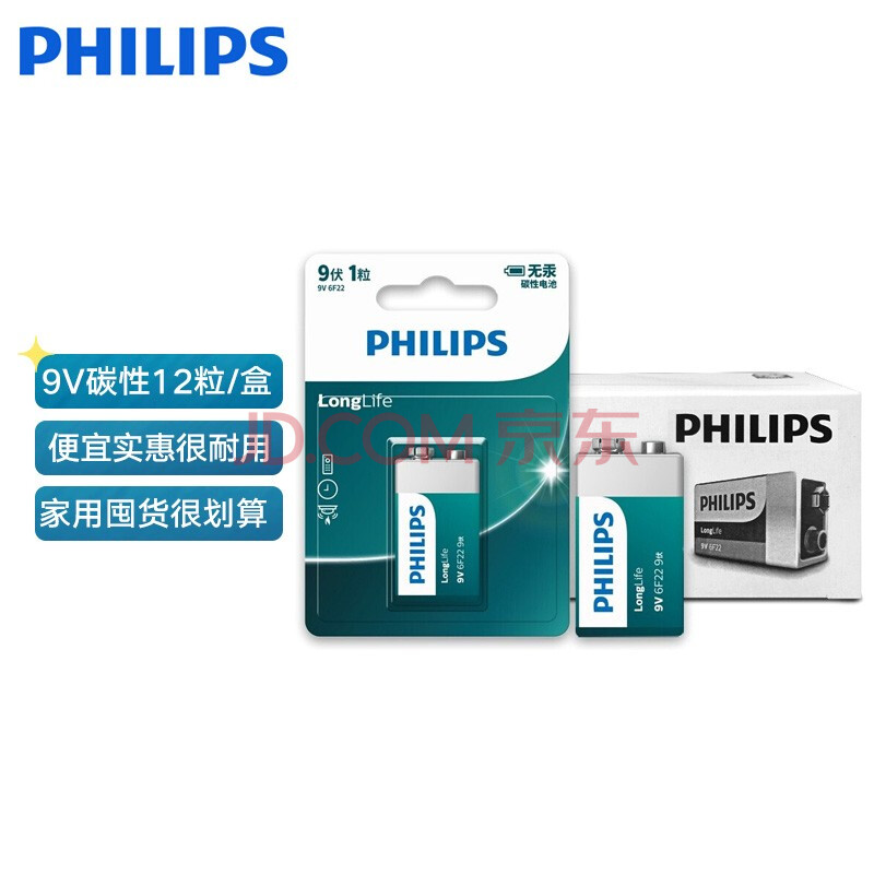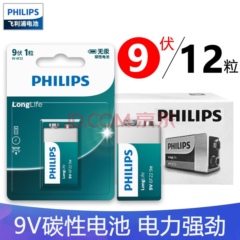 商品相册:飞利浦(PHILIPS)碳性9V电池12粒适用玩具/万用表/烟雾报警器/麦克风/遥控器/话筒等9V方块电池6F22第