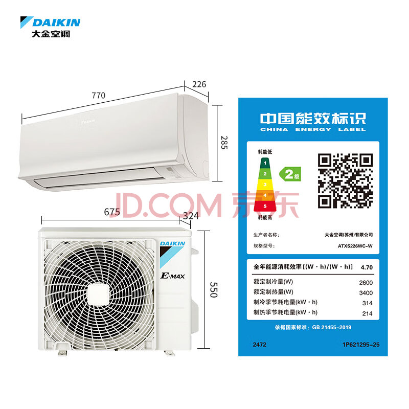 商品相册:大金(DAIKIN)空调 E-Max7 大1匹2级能效 康达无感气流纯铜管变频冷暖挂机ATXS226WC-W白色 第