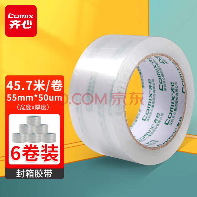 商品相册:齐心(COMIX)(Comix)透明胶带/宽胶带/封箱胶带加厚快递打包胶带透明6卷宽55mm*50y*50um长45.7米/卷JF5505-6第