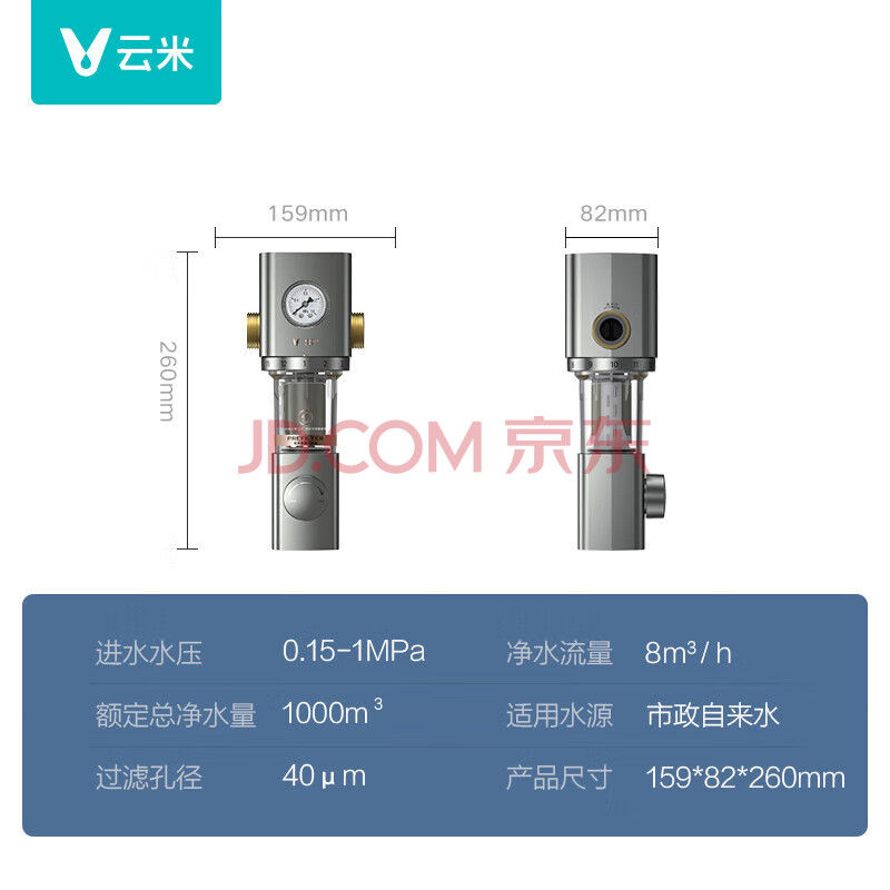商品相册:云米(VIOMI)前置过滤器自营家用自来水过滤器冲洗免换滤芯8T/h大流量中央管道自来水过滤 前置过滤器VF4-A第