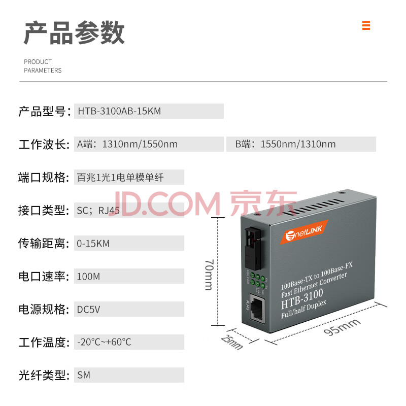 商品相册:netLINK HTB-3100AB-15KM 百兆单模单纤光纤收发器 光电转换器 SC接口 15公里 一对第