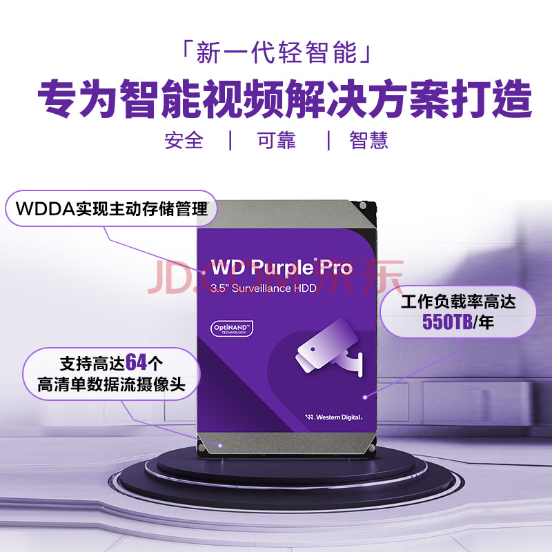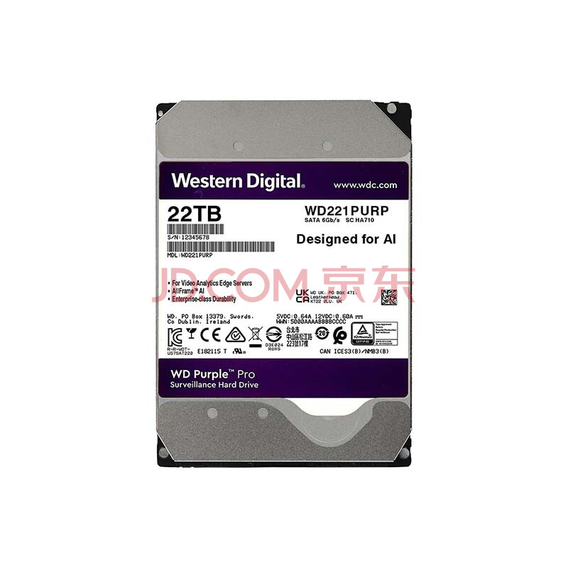 商品相册:西部数据(WD)22TB监控级机械硬盘 WD Purple 西数紫盘pro SATA 7200转512MB CMR垂直AI技术 3.5英寸WD221PURP第