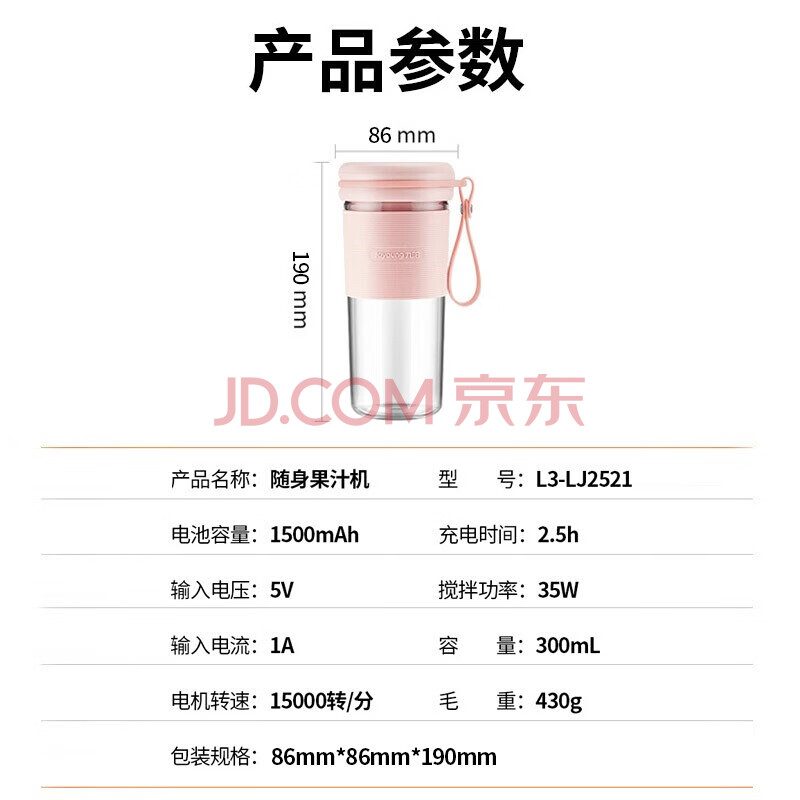 商品相册:九阳(Joyoung)榨汁机 便携式网红迷你无线果汁机料理机 0.3升 L3-LJ2521粉【企业采购】【支持一件代发】第