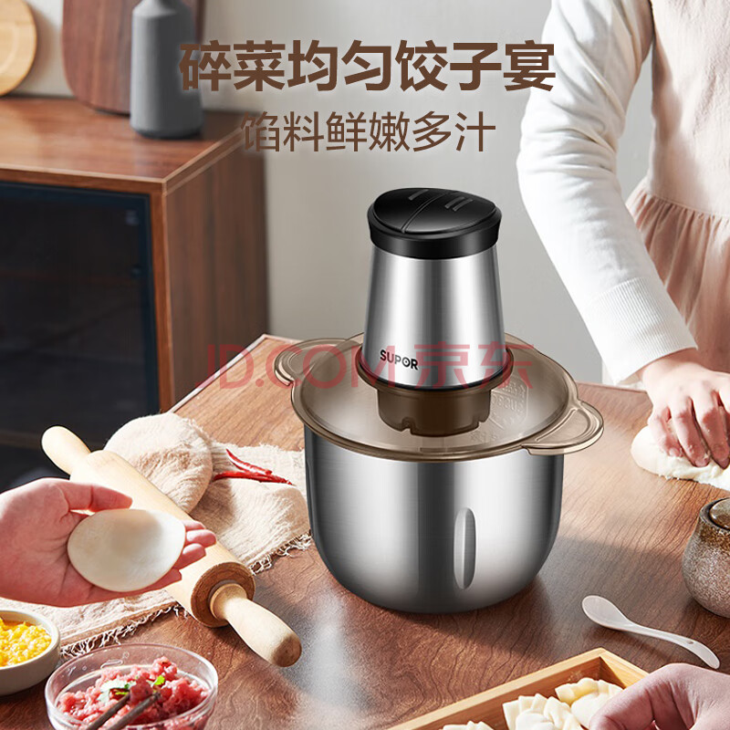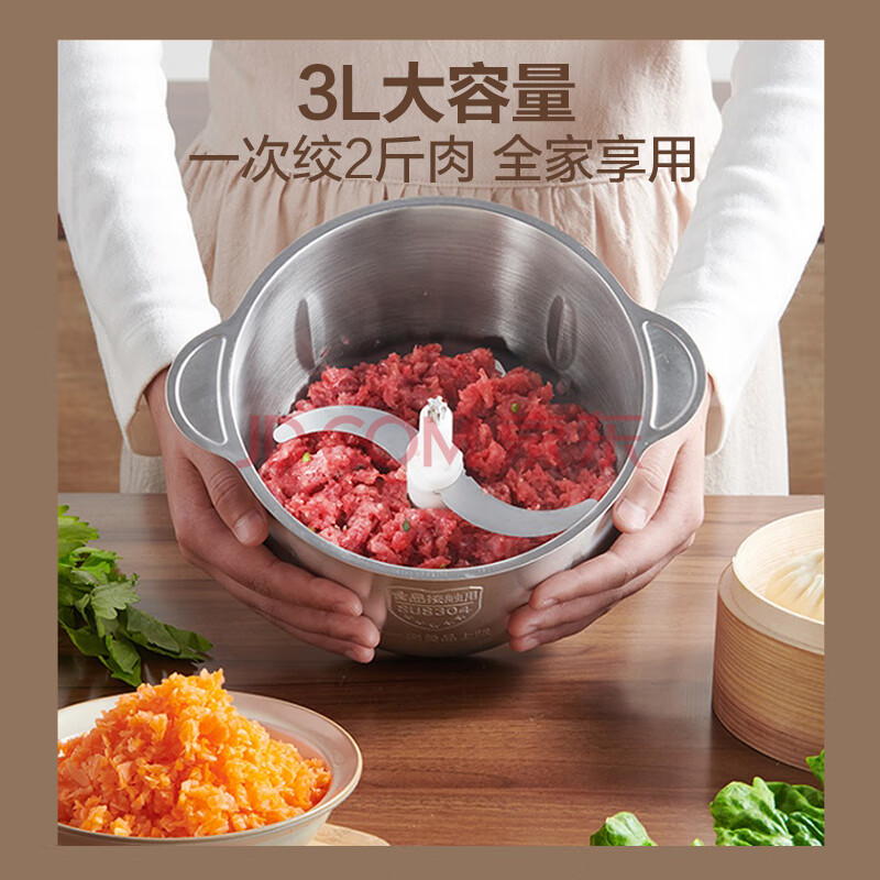 商品相册:苏泊尔(SUPOR)ZMD安心系列 全新升级防塞肉 不锈钢机身 500W大功率 S型立体四叶刀片 3L家庭大容量 绞肉机JRD06第