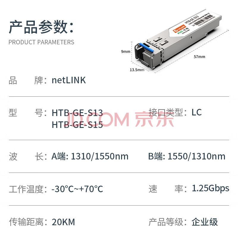 商品相册:netLINK sfp千兆光模块 1.25G单模单纤A端+B端 20km lc 适用国产设备 一对 HTB-GE-S13/S15第