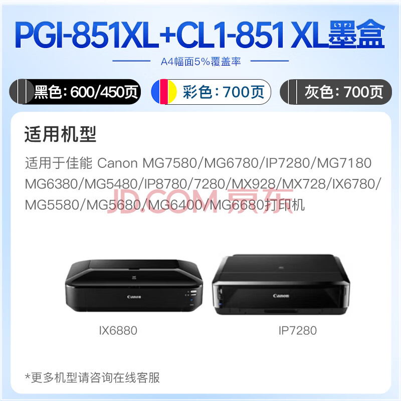 商品相册:得印CLI-851墨盒黄色适用佳能iX6880 iX6780 iP8780 ip7280 mg7580 mg6400 mg6380 mx928打印机墨盒第