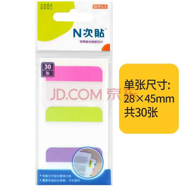 商品相册:N次贴(STICKN)荧光指示标签贴分类便签纸便利贴索引片45*28mm 纸标头易书写30枚3色34047第