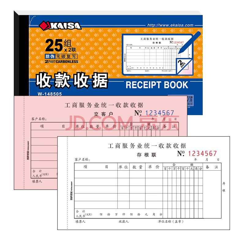 商品相册:凯萨(KAISA)48K/二联收款收据 两联25组工商服务多栏收据加厚无碳复写票据 财会单据10本装 W148505第