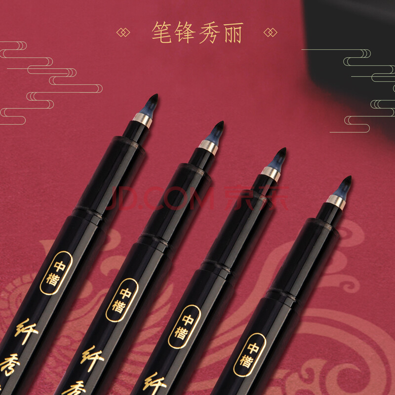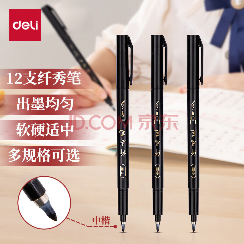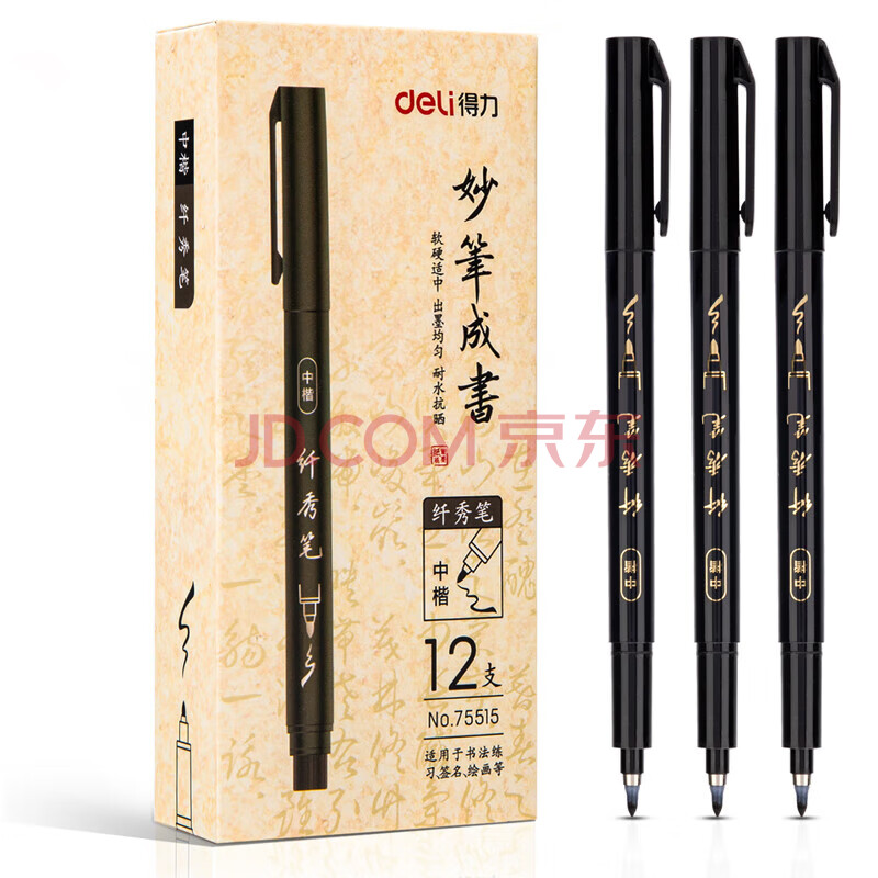 商品相册:得力(deli)黑色中楷纤秀笔秀丽笔毛笔练字笔 软笔签名学生成人书法练习笔开学礼物 12支/盒 开学文具第
