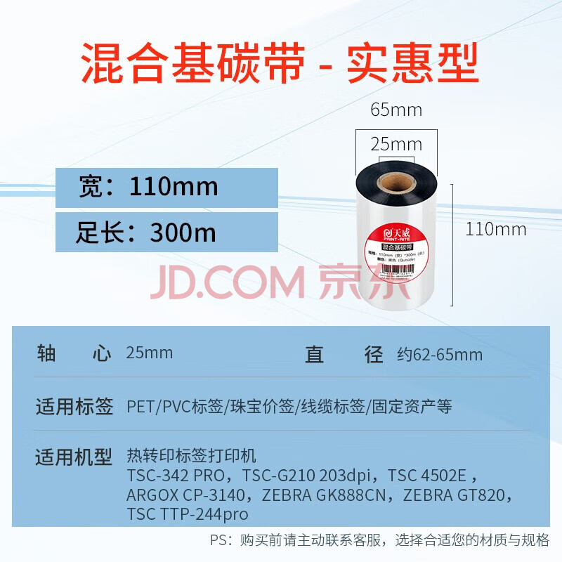 商品相册:天威 混合基碳带卷110mm*300m 双支装 标签机条码机热转印打印机色带第