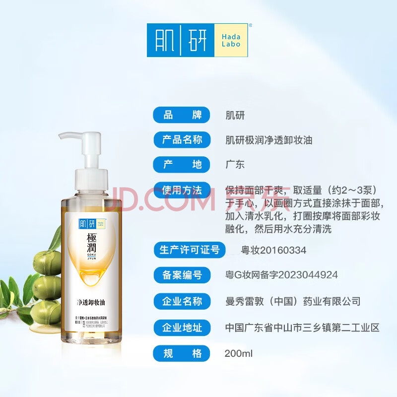 商品相册:肌研极润净透橄榄卸妆油200ml 深层清洁眼唇脸部卸妆油敏感肌不拔干第