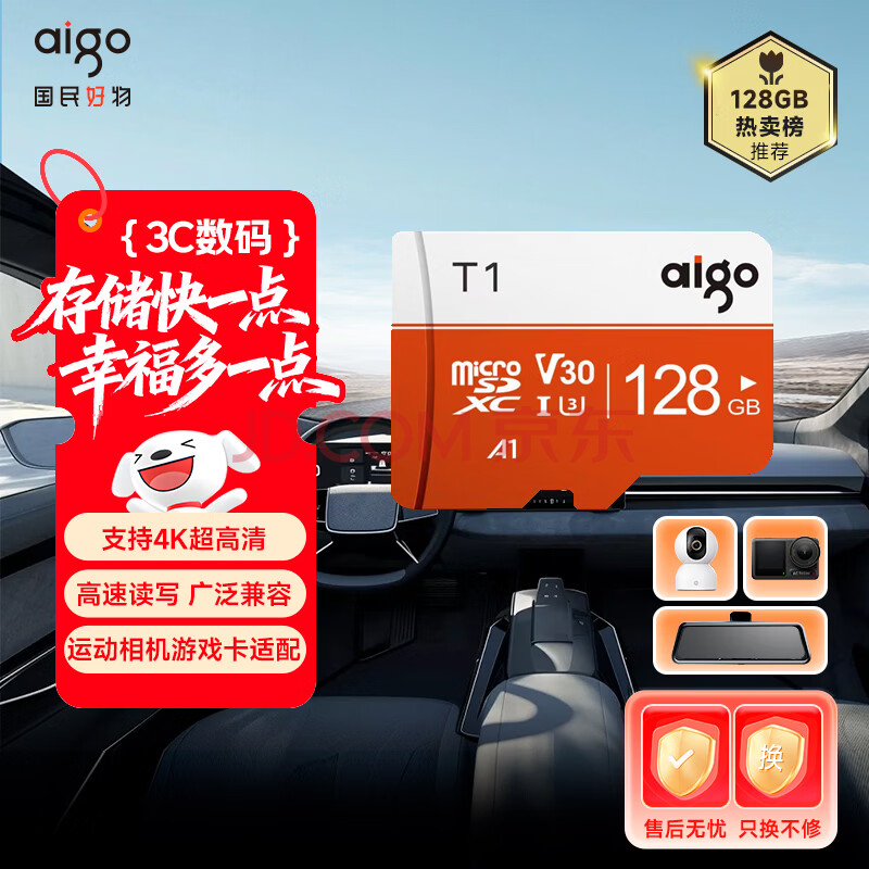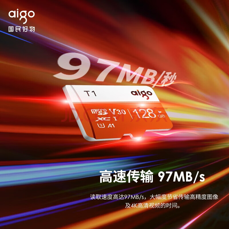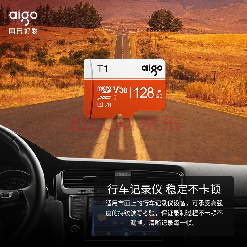 商品相册:爱国者(aigo)128GB TF(MicroSD)存储卡 U3 A1 V30 4K 监控摄像头 行车记录仪专用高速内存卡 T1 读速100MB/s第