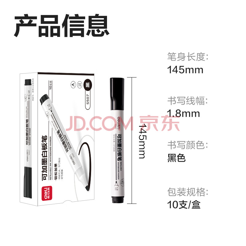 商品相册:得力(deli)可加墨白板笔 可擦易擦 10支黑 办公用品 S507第