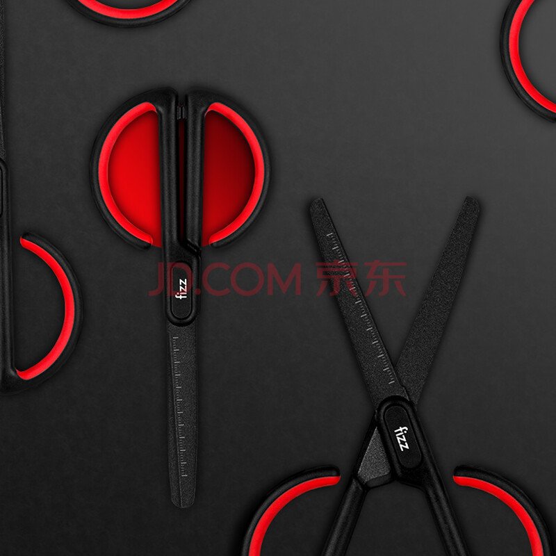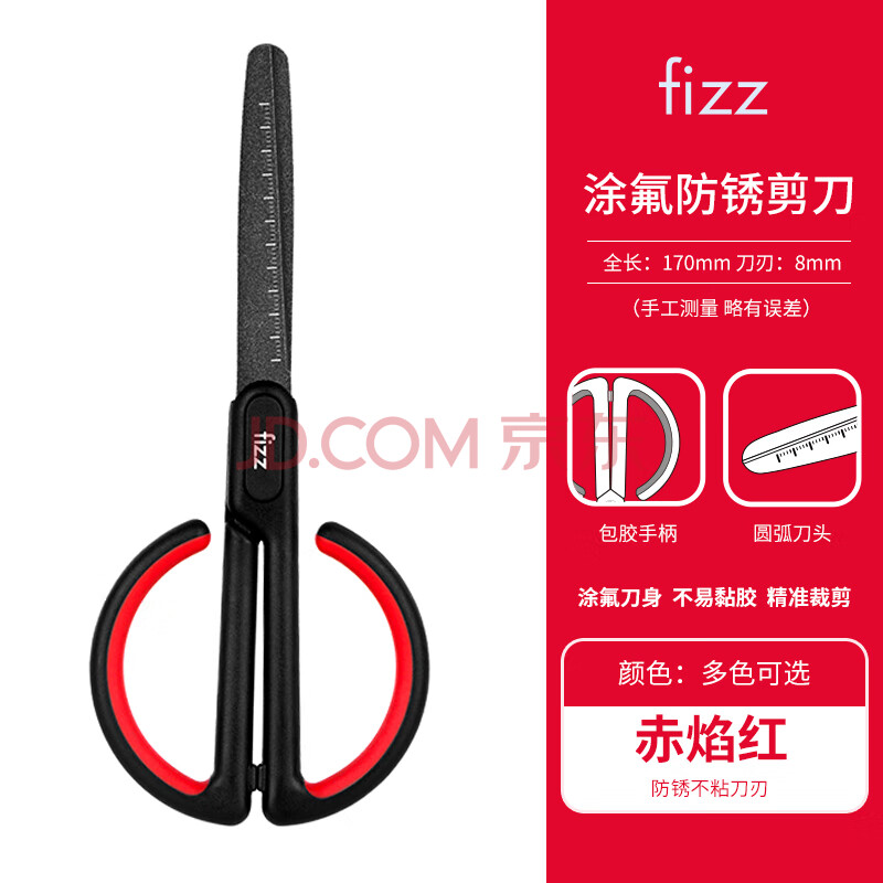 商品相册:飞兹(fizz)特氟龙材质防粘防水不锈钢弧形省力剪刀自带刻度安全圆头办公居家拆快递剪纸红色FZ212003第