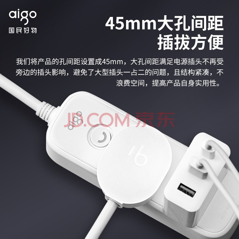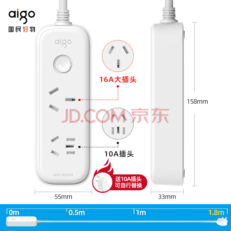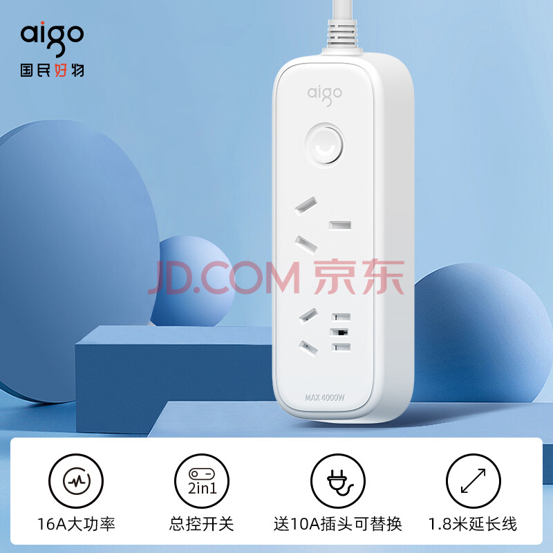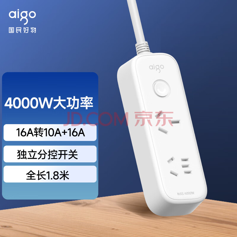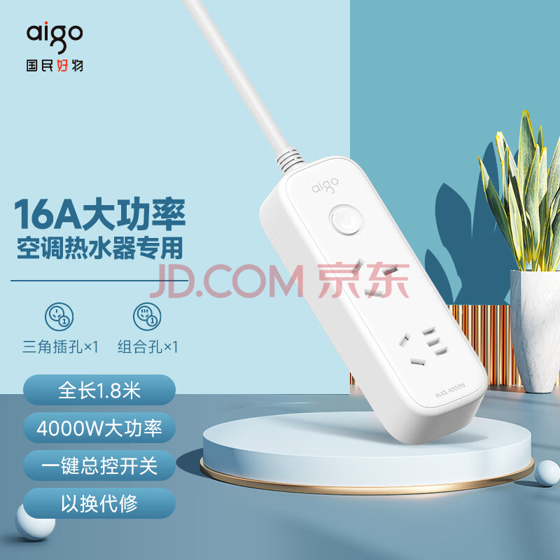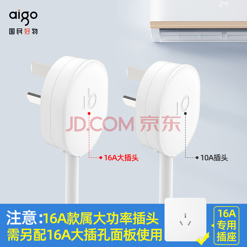 商品相册:爱国者(aigo)16A大功率插座排插/16A转10A转换器空调插座一转二转换插头插排接线板 2位总控全长1.8米AC0201D第